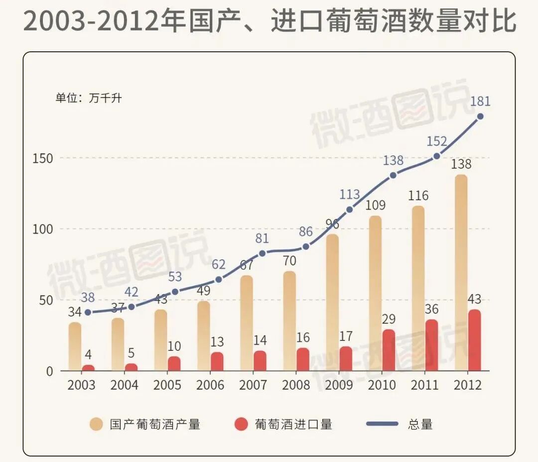 从国家统计局、海关发布的数据来看,2003-2012年是国产、进口葡萄酒连续增长的十年。在这段时期,国产葡萄酒有着绝对的优势地位,年复合增长率近30%。