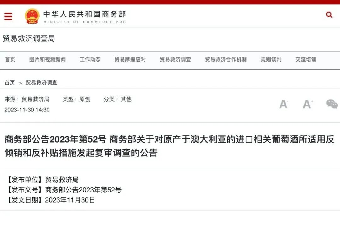 11月30日,国家商务部发布公告,决定自2023年11月30日起对原产于澳大利亚的进口相关葡萄酒所适用反倾销措施和反补贴措施进行复审。