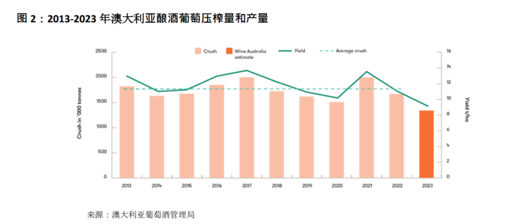 此外,根据澳大利亚葡萄酒管理局(Wine Australia)今年7月发布的《2023年全国葡萄酒报告》(National Vintage Report 2023),2023年澳大利亚酿酒葡萄产量预估132万吨,比2022年下降24%,为2000年以来最低水平。与10年平均水平相比,减少的46.6万吨压榨量相当于约3.25亿升葡萄酒。