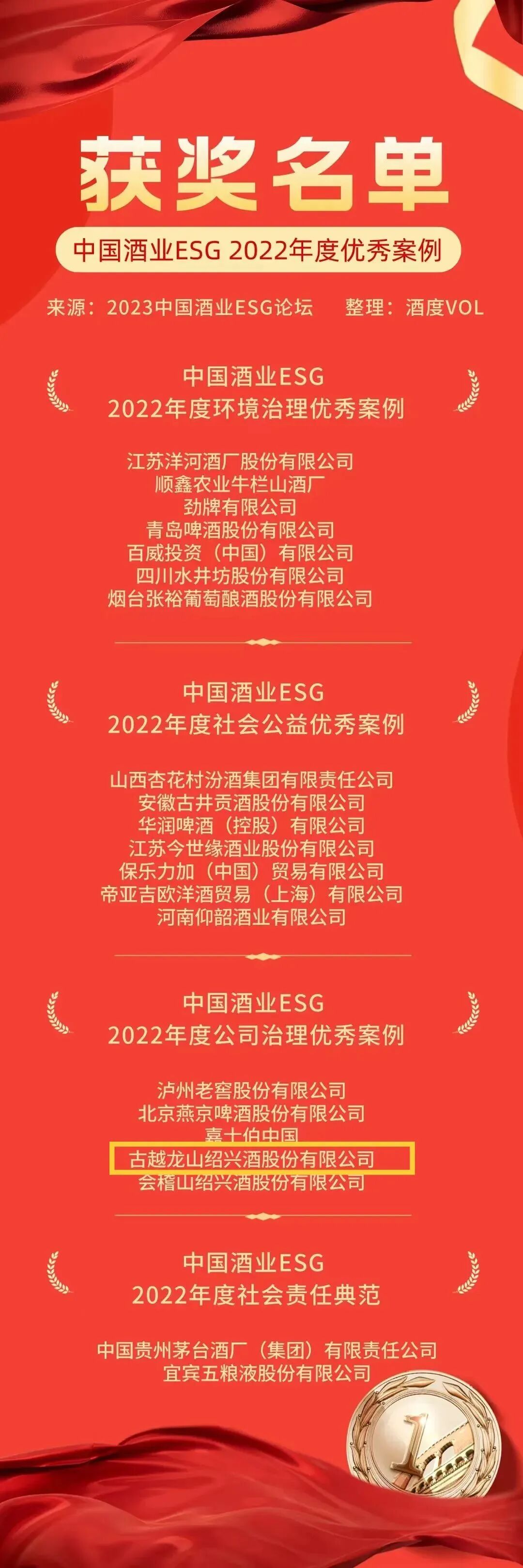 11月24日,由中国酒业协会、新浪财经联合主办,酒与社会责任促进工作委员会承办的2023中国酒业ESG论坛在京举行,对“中国酒业ESG 2022年度优秀案例”进行了表彰。古越龙山绍兴酒股份有限公司获得2022年度公司治理优秀案例。