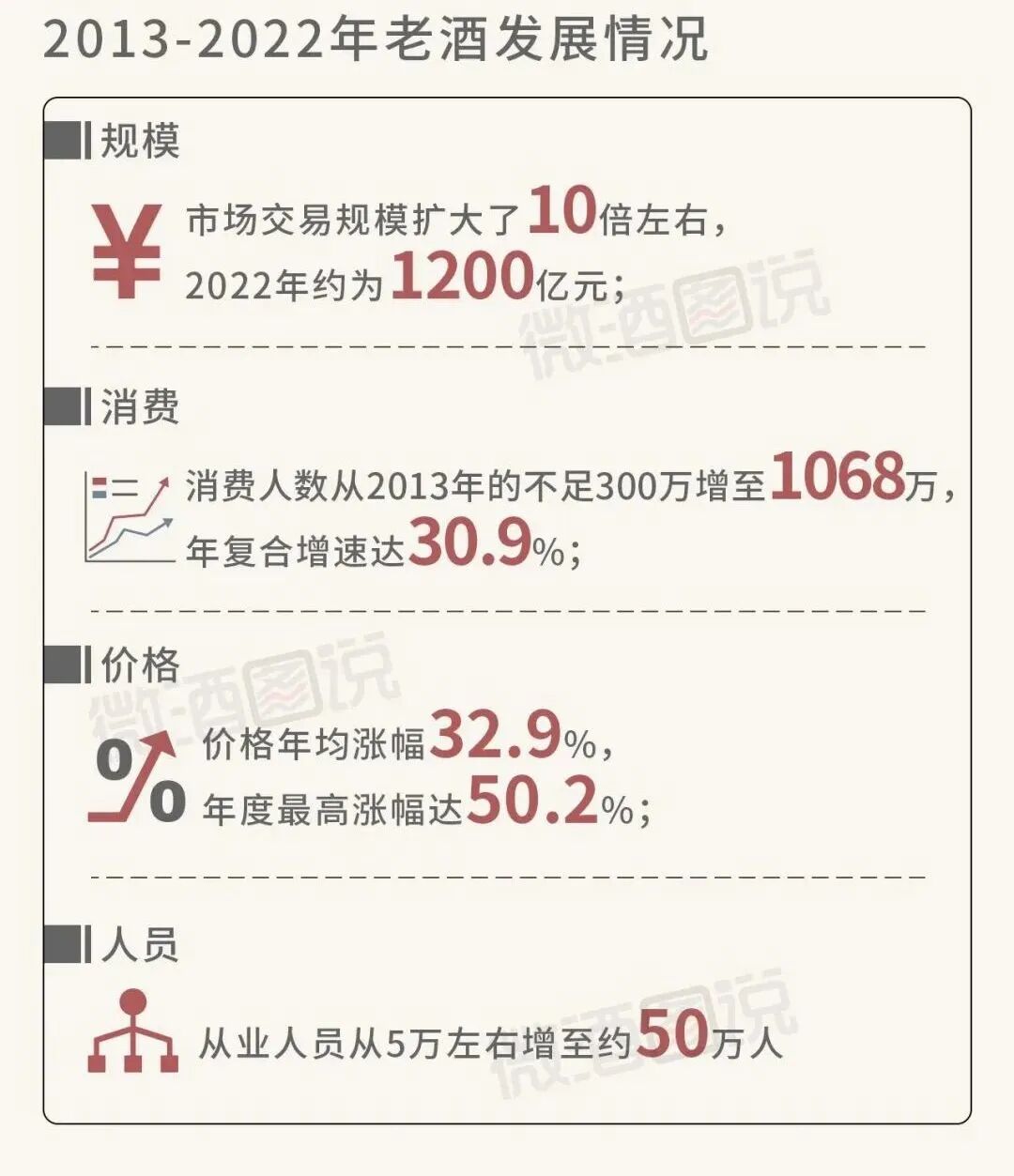 价格:2013-2022年,老酒的价格年均涨幅32.9%,年度最高涨幅达50.2%;