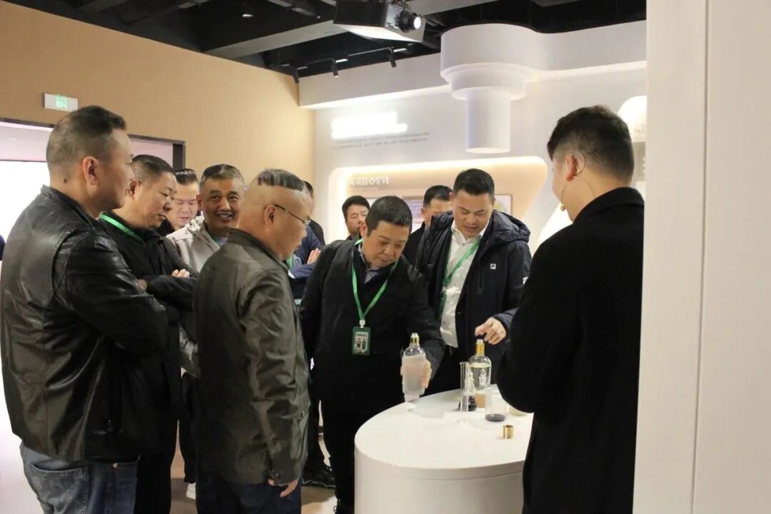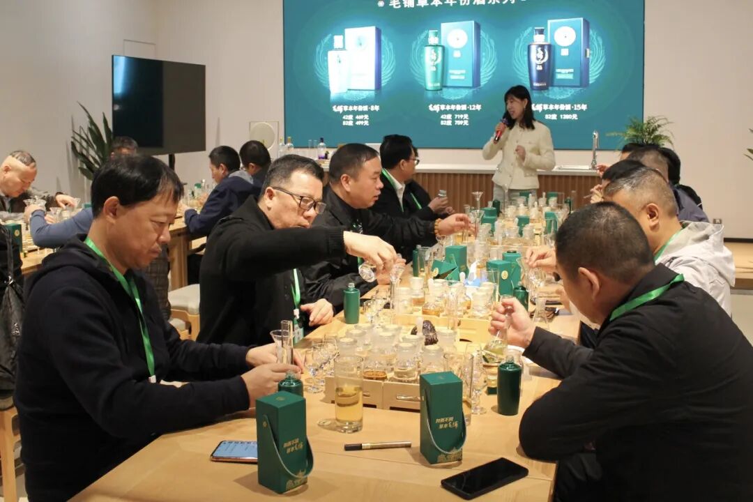 ▲考察组一行在品鉴区品鉴毛铺草本年份酒并进行DIY三香调酒