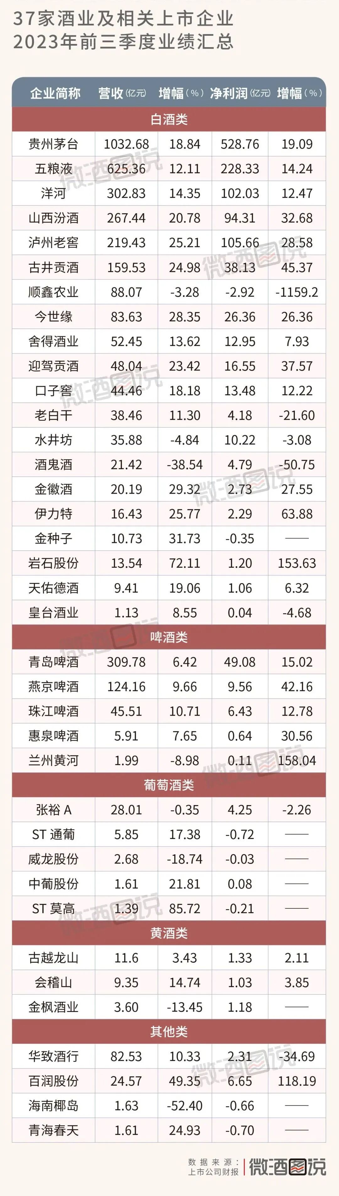 截止10月30日,37家上市酒企2023年三季报已全部出炉。其中白酒行业上市公司...