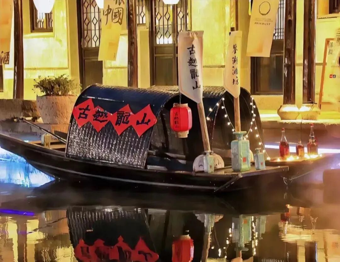 平静的湖上停着几艘乌篷船,晃晃悠悠地载着绍兴黄酒,游客在悠闲中体验琥珀色的微醺一刻,感受古越龙山的风情韵味。