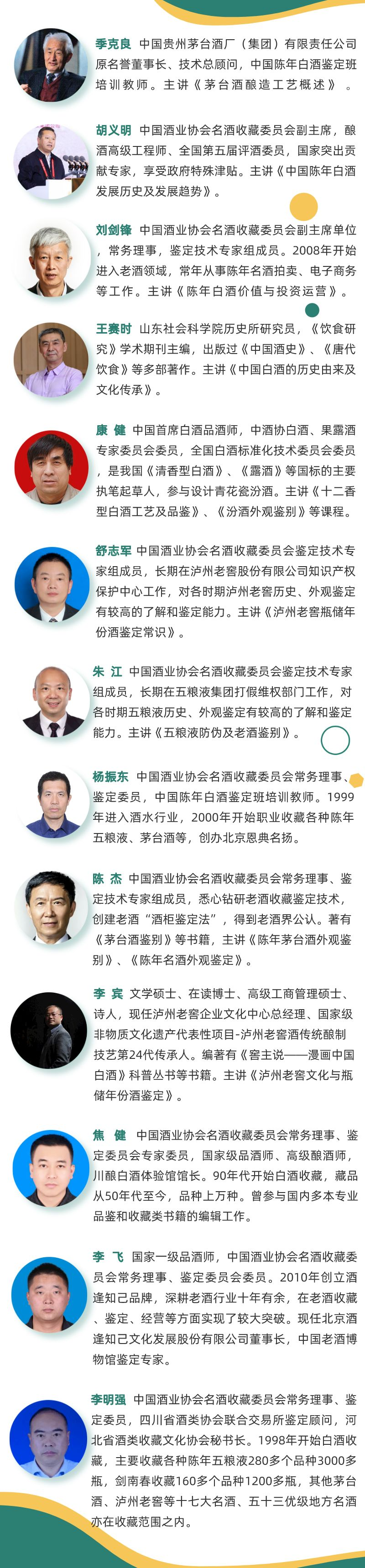 中国酒业协会聘任的中国酿酒大师、首席白酒品酒师、科研院所检测机构技术专家、陈年白酒外观鉴定专家(名酒厂打假办人员)及名酒收藏行业专家等。