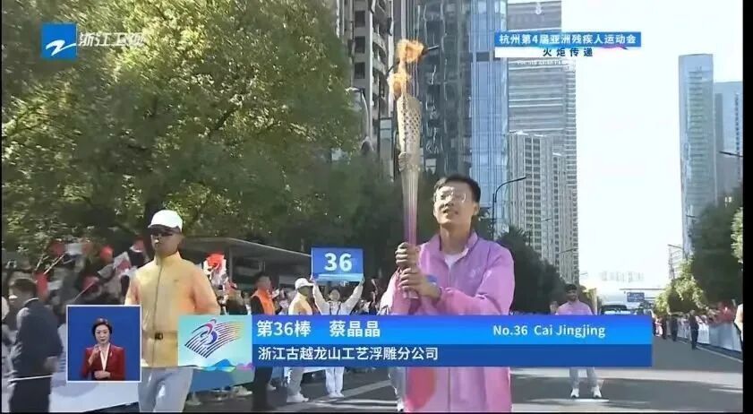 10月21日上午,杭州第4届亚残运会火炬传递来到萧山,浙江省技术能手、绍兴市青年岗位能手、古越龙山工艺浮雕酒分公司员工蔡晶晶接力第36棒。