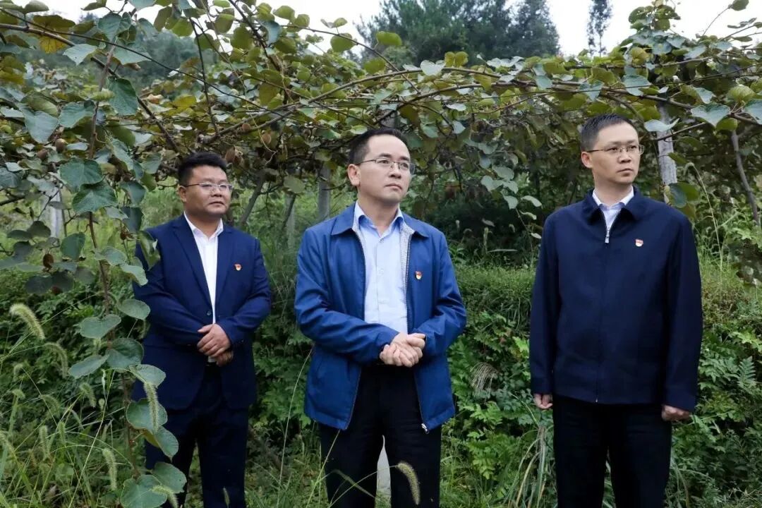 ▲张德芹(中)、汪地强(右一)实地查看永胜村四合组四坪坝猕猴桃基地情况