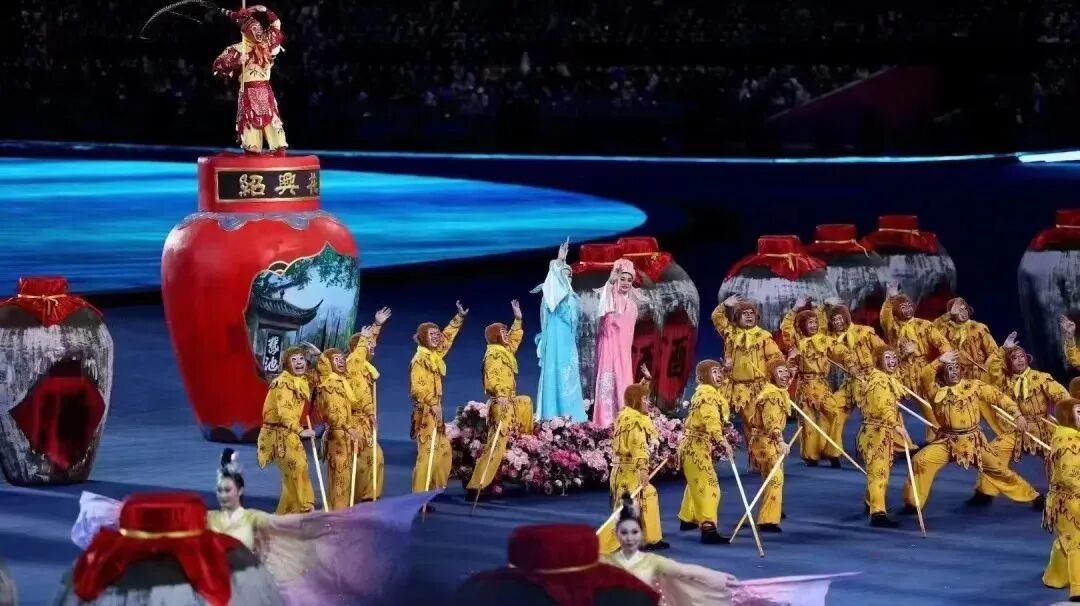 当大幕拉开,绍兴《美哉古越》亮相登场,越剧的唱腔响彻整个场馆,绍剧中经典角色“猴王”的舞台表演,巨大的绍兴花雕酒坛,绍兴的三张“金名片”融合在一起,最具有代表性的绍兴元素,呈现在全世界观众的面前。