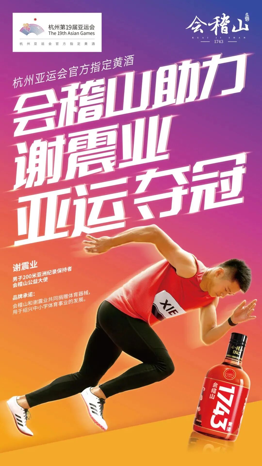 将“中国黄酒”和“运动盛宴”创新结合,加大黄酒线上线下品牌营销力度,搭建新饮用场景。在品牌形象上,签约中国著名短跑运动员谢震业为会稽山品牌公益大使,和谢震业共同围绕亚运会和青少年体育事业做品牌公益活动,“中国黄酒与亚洲飞人”的跨界合作引起行业内外的关注。