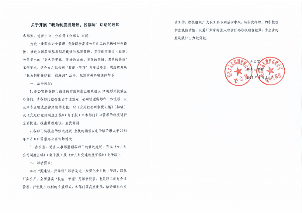 公司各部门结合集团管理规定、公司管理实际和工作流程,以及本专业领域法律法规的变化,对《女儿红公司制度汇编》(初稿)及《女儿红党建制度汇编》中本部门归口管理的制度进行全面梳理,提出修改建议,查漏补缺。广泛组织动员职工参与,以爱厂如家的主人翁责任感积极建言献策,力促职工转变思想观念、提升管理效能、树立正能量,推进公司又快又好发展。