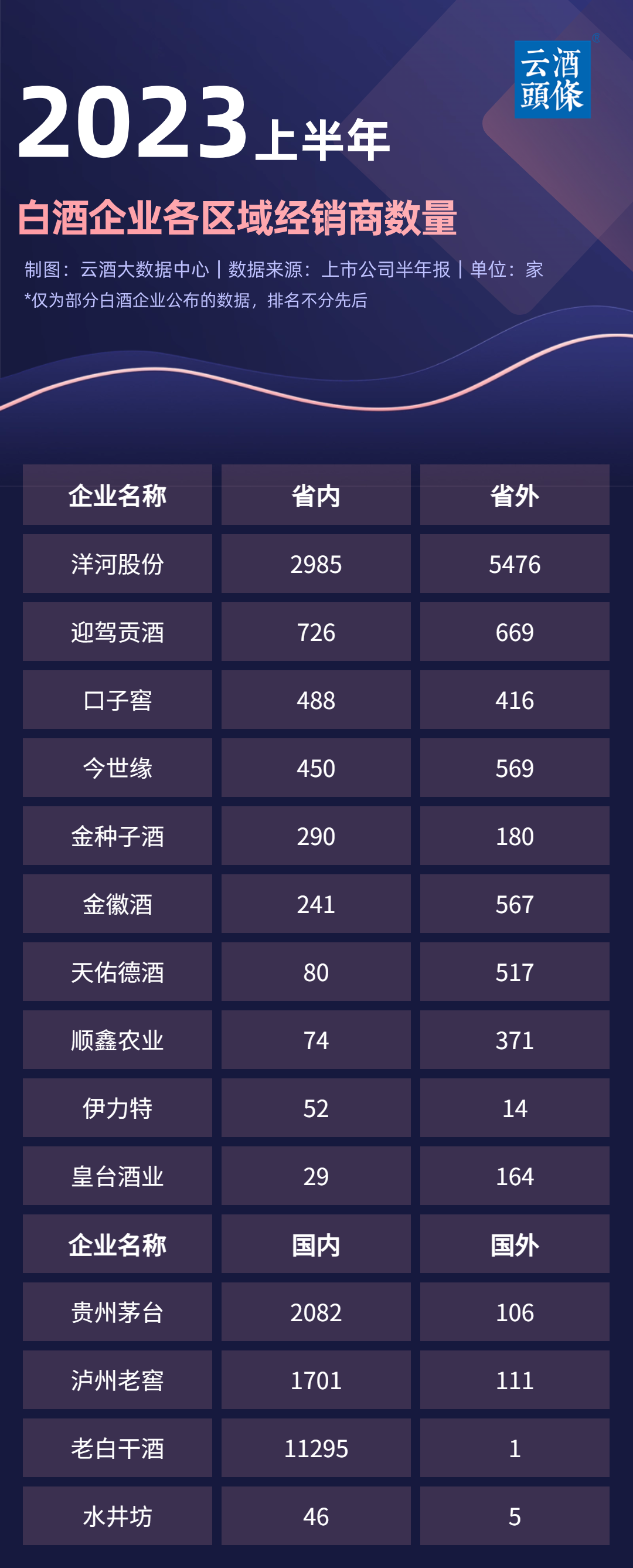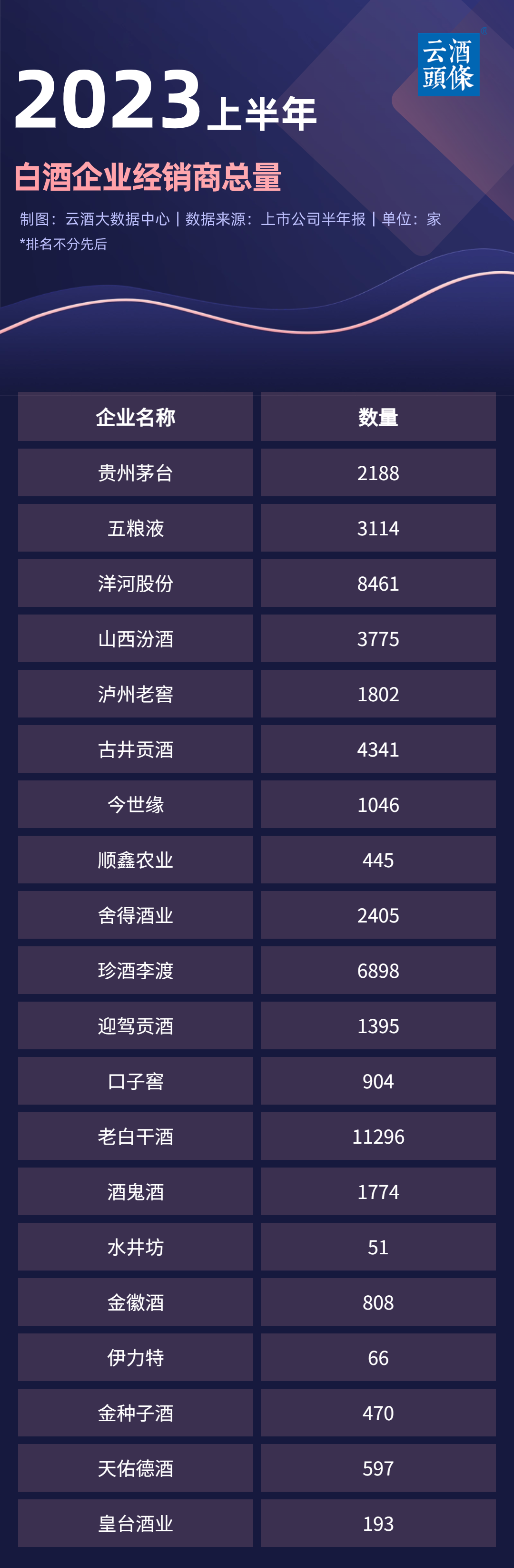 数据显示,截至今年6月,20家白酒上市企业,共有52029家经销商。其中,经销商数量排名前三的是老白干酒、洋河股份和珍酒李渡,分别为11296家、8461家和6898家,3家占据了经销商总数的一半以上。