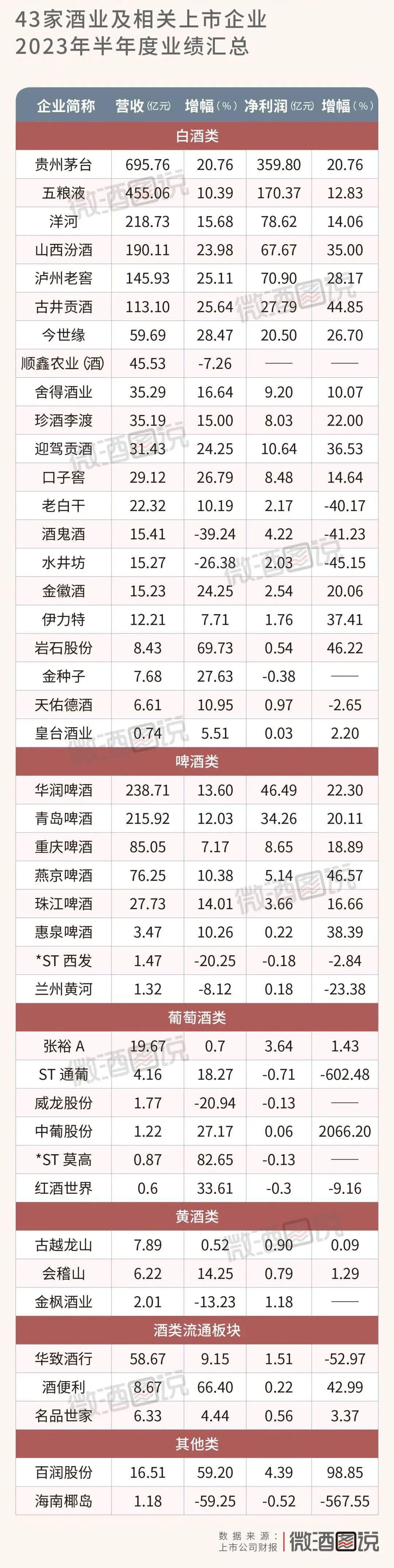 截止8月30日,43家上市酒企2023年半年报已悉数披露。根据已披露的上市公司业...