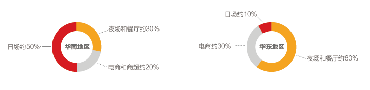 华南华东地区占据中国威士忌消费的大头。基于地区消费习惯的不同,渠道间的销售额占比会存在比较大的差异。经过调研,华南地区日场占比能够达到大约50%, 夜场和餐厅占比约30%, 电商及商超占比约20% 。而在华东地区,日场仅占比约10%, 夜场占据绝对的主要地位达到约60%, 电商占据约30% 。