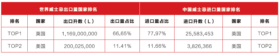 其中,英国及美国的进口量排名与其出口量的世界排名保持—致。对比中国威士忌进口占比及世界威士忌出口占比,可以明显看出中国从英国进口了更多的威士忌,而美国则基本与其出口水平持平。