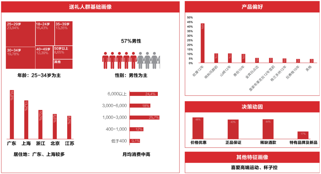 在电商八类人群中,有送礼需求的消费者占总人群的44%,单价约为1,116元,大致反映了电商渠道送礼的平均水平。另外送礼人群虽然看重正品保证,但仍然是价格敏感人群。在送礼选择上,高品质的苏格兰威士忌以及市场热度较高的日本威士忌,都更受到消费者追捧。