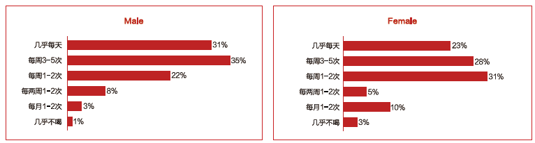 从饮酒频率上来看,男性的饮酒频率更高。31% 的男性几乎每天都喝酒, 66%的男性每周至少喝3次。女性整体频率稍低, 31%的女性每周只饮用1-2次。从年龄段上来看,每天都饮酒的主力为40岁以下人群,超过40岁且每天都饮酒的人只有22%, 相对应的,每周饮酒1-5次的人数有—定的提高。