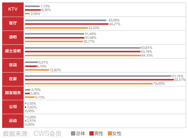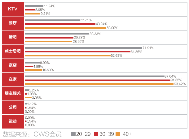 当然,不同年龄段的人,在饮用场景上也会有不同的偏好。例如:40岁以上的爱好者在家自饮、在夜店和在餐厅的比例最高,但是在KTV、清吧、威士忌吧等相对更年轻态的场所,30岁以下的爱好者比例最高。