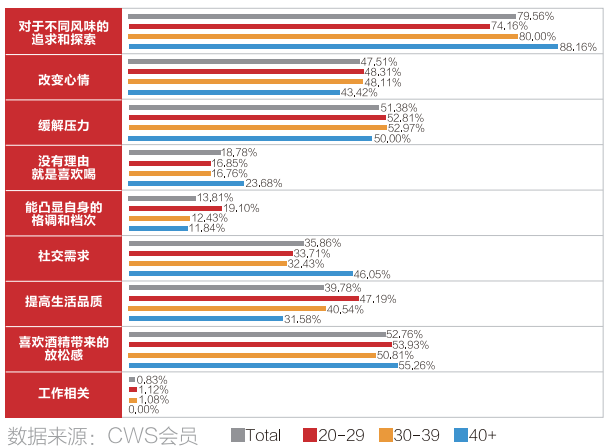 在品饮原因方面,79.56%的爱好者认为自己喝威士忌是基于对风味的追求,排名前三的原因还有“喜欢酒精带来的放松感”和“缓解压力”。其中,男性为了缓解压力而饮用威士忌的占比比女性更高。从年龄分段来看,30岁以下的爱好者更多出于对格调和档次的需求,40岁以上的爱好者则更多出于社交需求。