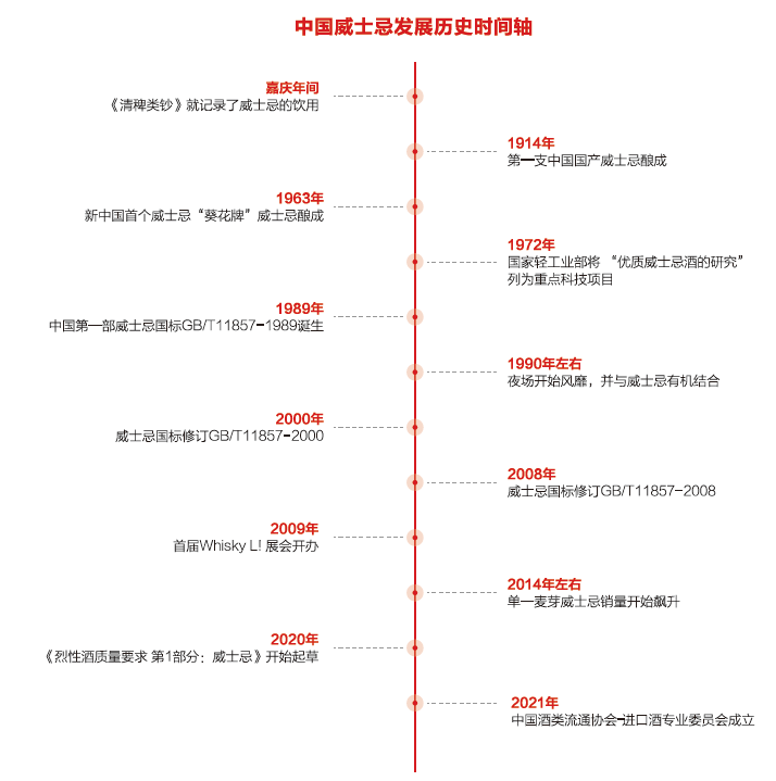 酿酒科技1994年发布论文探讨了威士忌蒸熘器的设计和蒸熘过程, 1995年讨论了威士忌酵母菌的选育。2000年,威士忌国标重新修订。2005年年底,中国台湾的噶玛兰酒厂建成。2008年威士忌国标第三次修订,并沿用至今,期间,更多威士忌酿酒厂如同雨后春笋般出现。