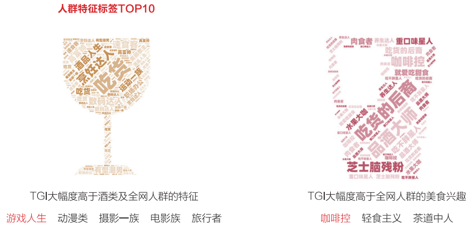 结合淘宝阿里的消费者人群标签,“吃货”Tag占比很高,游戏、动漫、电影、摄影的TGI高于酒类及全网人群。在美食兴趣方面,威士忌消费者对咖啡、轻食、茶都有比较高的偏好。结合两种标签来看,威士忌作为一种品鉴属性比较强的产品,其消费者普遍对于风味都有一定的追求。所以威士忌品牌若想在线上进行破圈推广,品鉴属性和风味等关键词的使用、咖啡和茶饮人群的破圈和联动,都会有较大的机会。