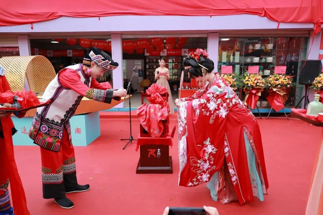 在开启仪式上,富有江南水乡风韵的“乌篷船”载着女儿红缓缓驶来,来到滇池之畔的七彩云南;彝族少男少女从船上迎娶十八年的桂花林藏来到现场,女儿红公司党委书记、董事长胡志明,昆明绍兴商会会长徐洪尧一起掀起了盖着红绸缎的“女儿红”浮雕酒,象征着最经典“女儿红”在七彩之乡相亲相爱、安家落户。
