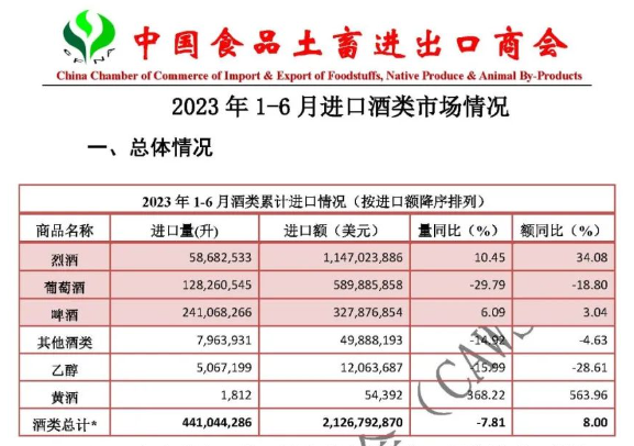 7月26日,中国食品土畜进出口商会酒类进出口商分会发布《2023年上半年酒类进口情况》。数据显示:2023年1-6月,我国酒类累计进口额21.27亿美元,同比增长8%,累计进口量为4.4亿升,同比下降7.8%。