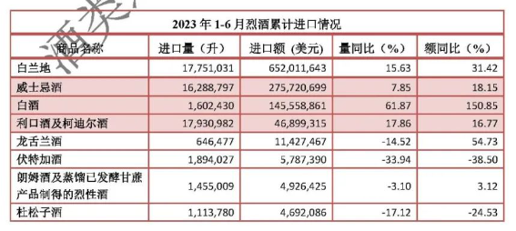 数据显示,2023年1-6月,烈酒进口量5868.25万升,增长10.45%;进口额11.47亿美元,增长34.08%,量额大幅增长之下,进口酒第一大品类优势进一步扩大,份额占比高达54%,再创历史新高。