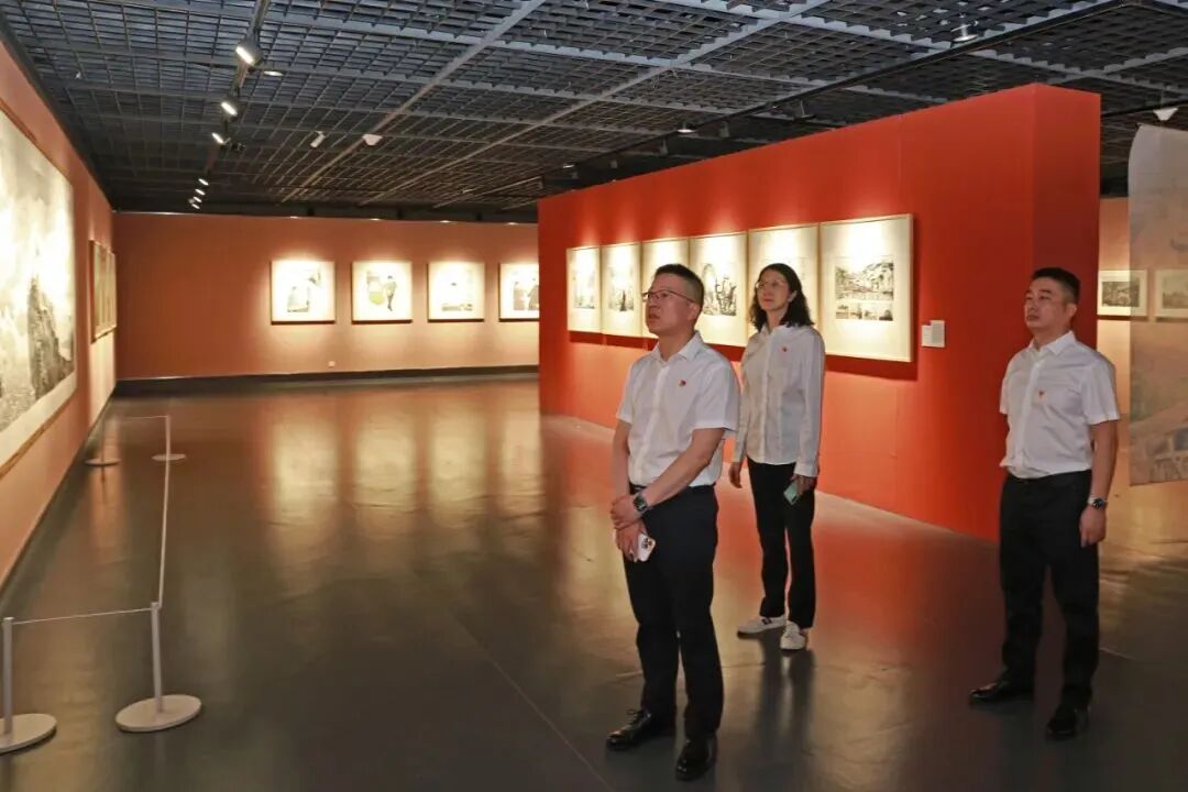 党员依次参观艺术展各个展厅,时而细细欣赏,时而小声讨论。陈列的作品包括中国画、油画、版画等艺术形式,从经济建设、交通强省、政务服务、生态环境、社会文化等多个维度表达了浙江的“八个方面优势”,以及浙江深入推进 “八个方面举措”的生动实践。通过作品能够深刻感受到浙江省在“八八战略”指引下,一张蓝图绘到底,一任接着一任干,努力做到“干在实处、走在前列、勇立潮头”的精神风貌。