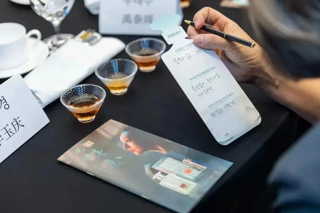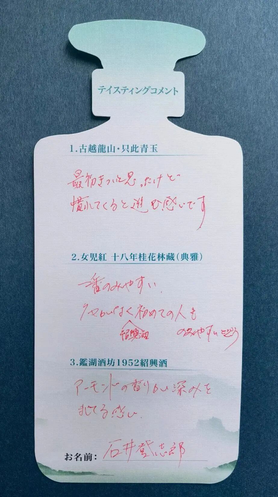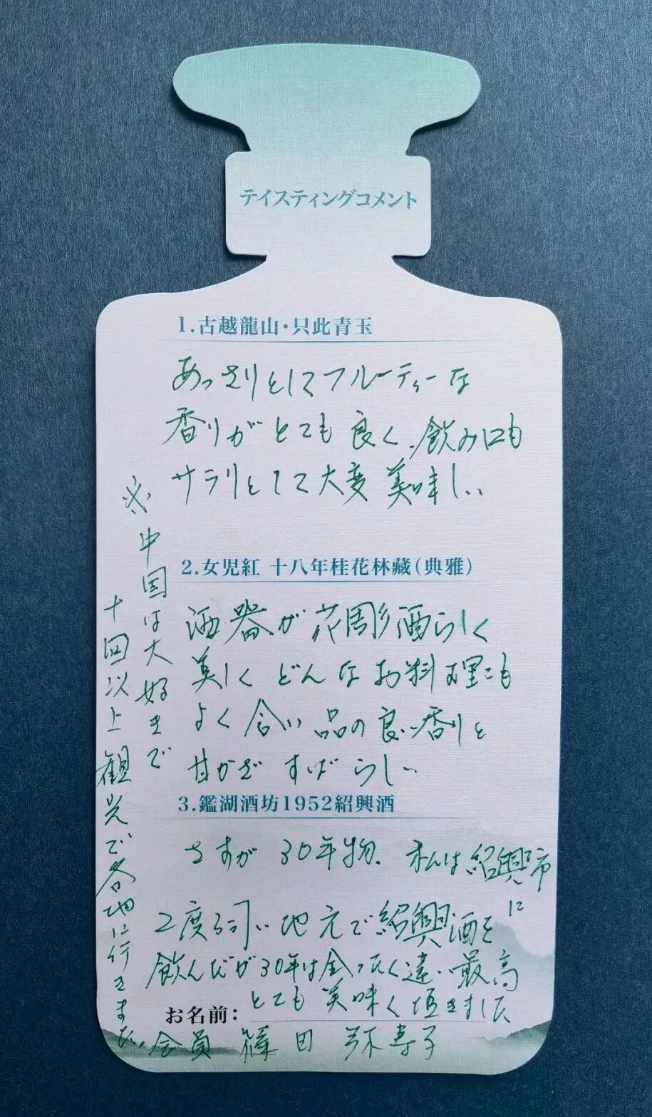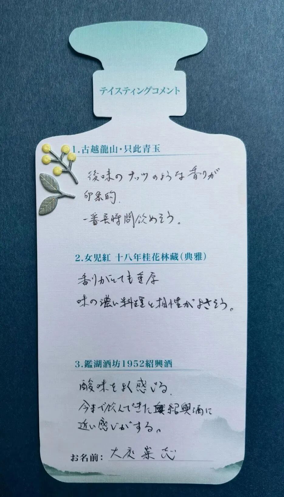 嘉宾们细细品鉴绍兴酒、认真撰写品鉴词。现场收集品鉴卡100多张,字里行间都对古越龙山绍兴酒给予了高度评价。对“只此青玉”“桂花林藏”“鉴湖1952”三款酒纷纷留下品鉴感受。