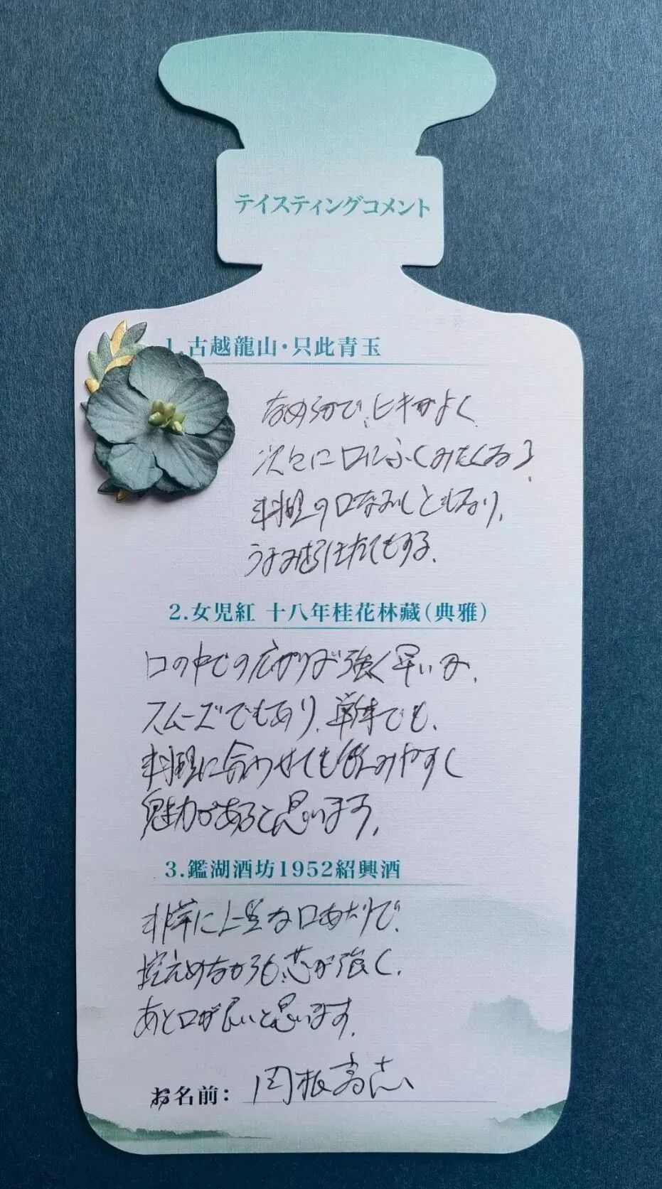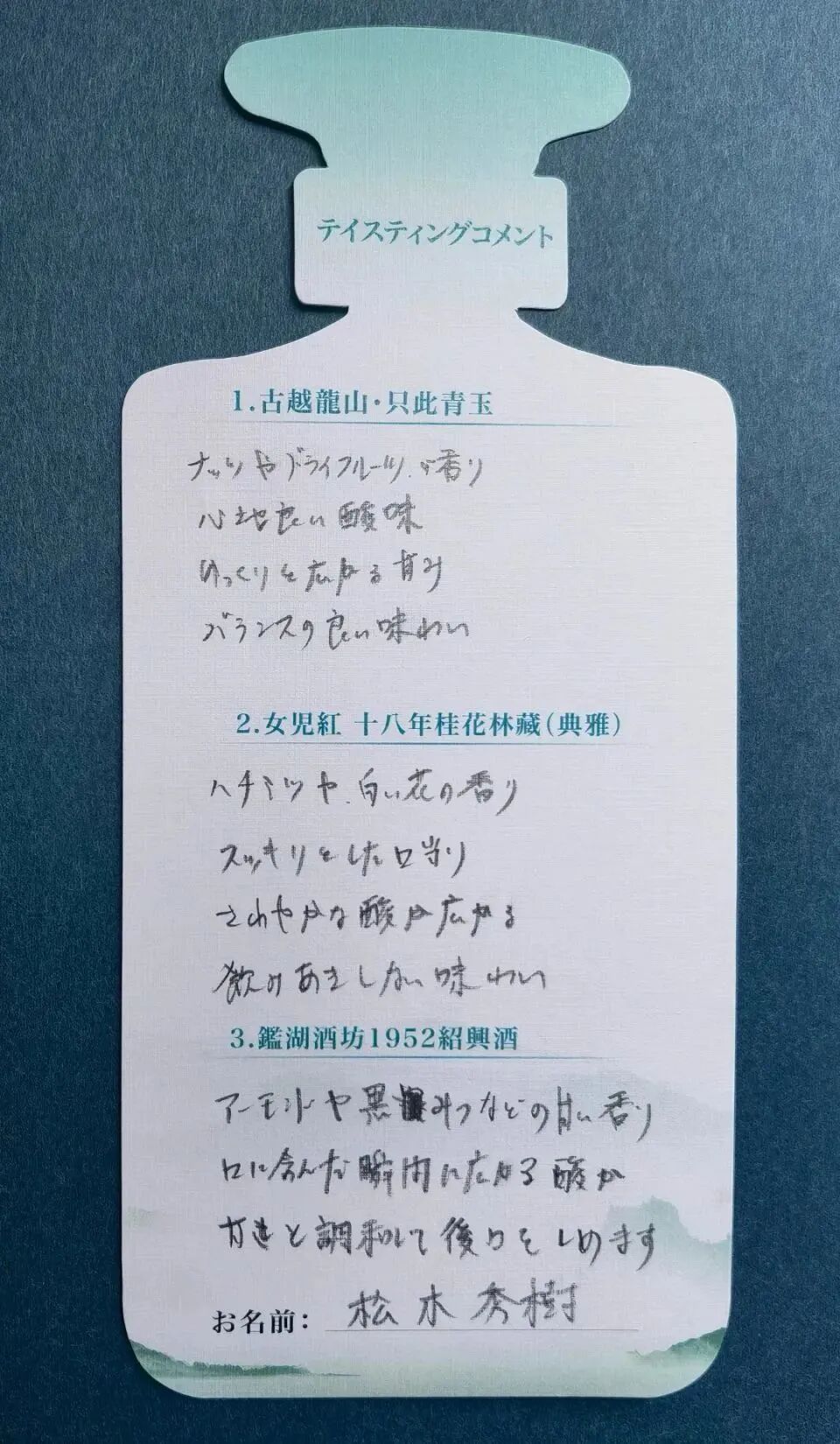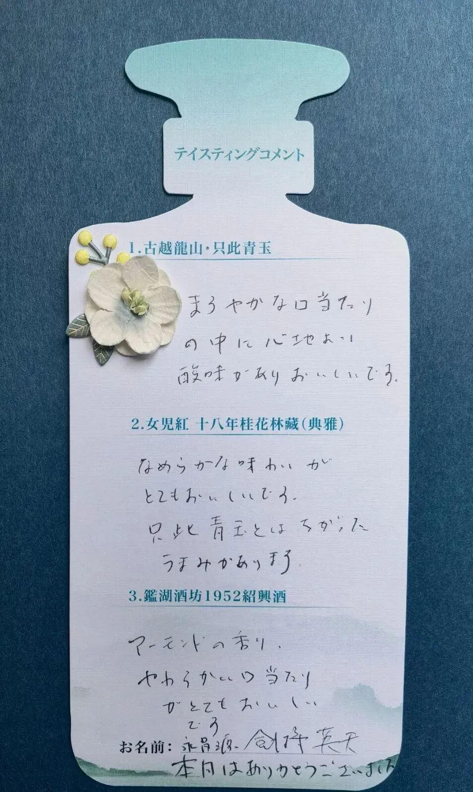 嘉宾们细细品鉴绍兴酒、认真撰写品鉴词。现场收集品鉴卡100多张,字里行间都对古越龙山绍兴酒给予了高度评价。对“只此青玉”“桂花林藏”“鉴湖1952”三款酒纷纷留下品鉴感受。