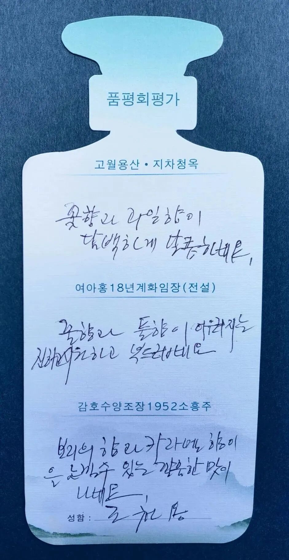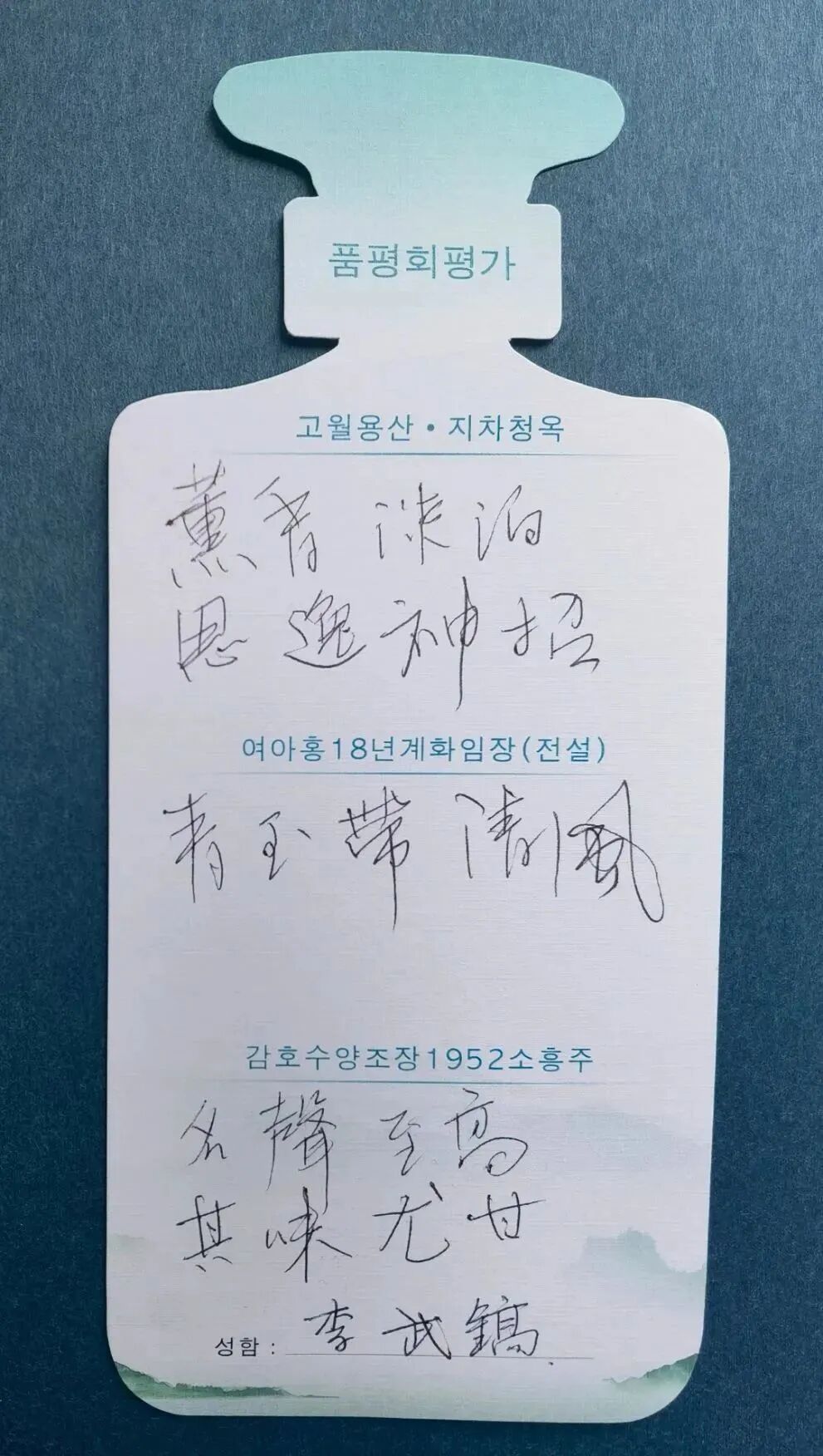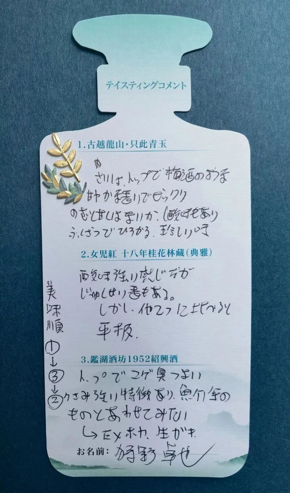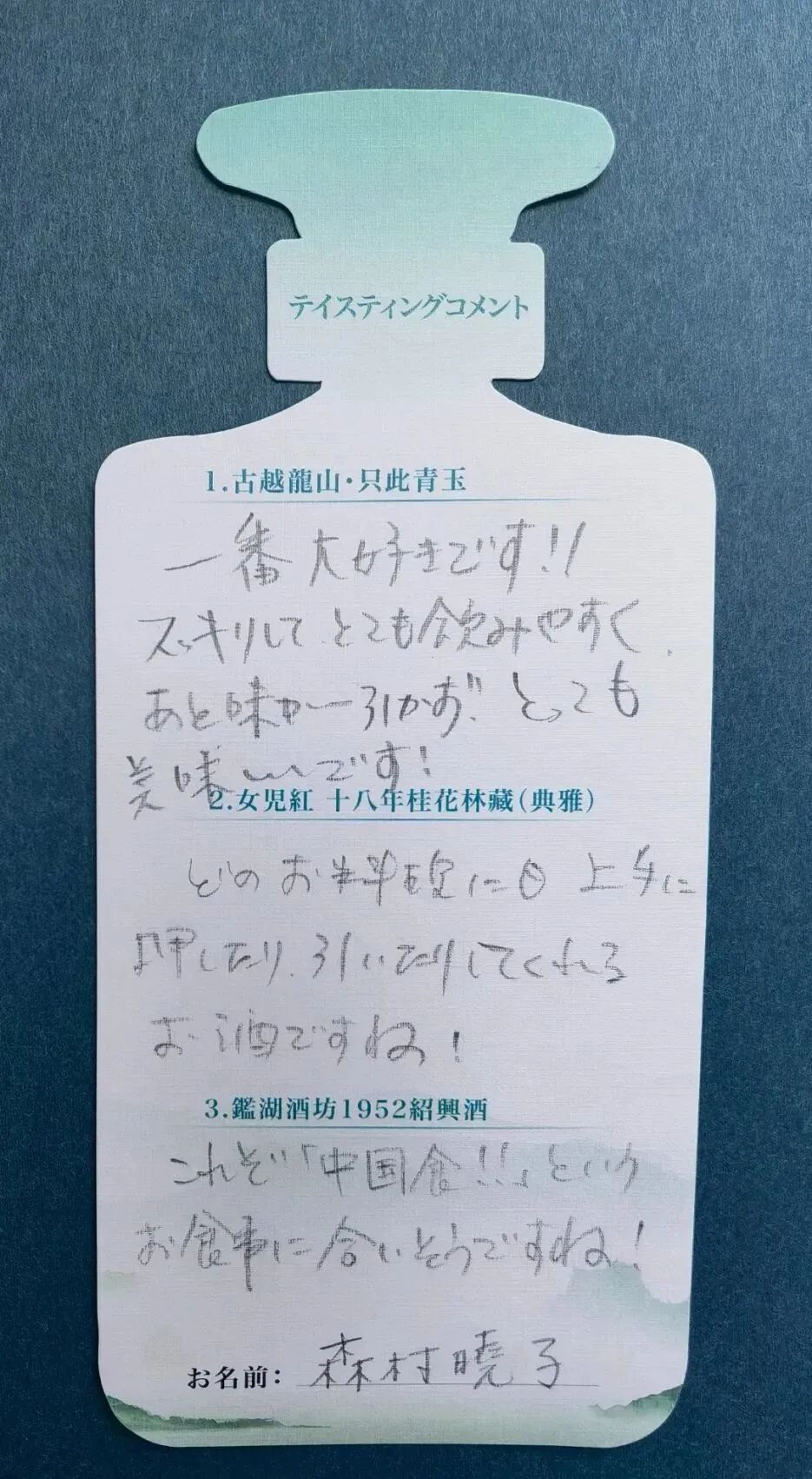 嘉宾们细细品鉴绍兴酒、认真撰写品鉴词。现场收集品鉴卡100多张,字里行间都对古越龙山绍兴酒给予了高度评价。对“只此青玉”“桂花林藏”“鉴湖1952”三款酒纷纷留下品鉴感受。