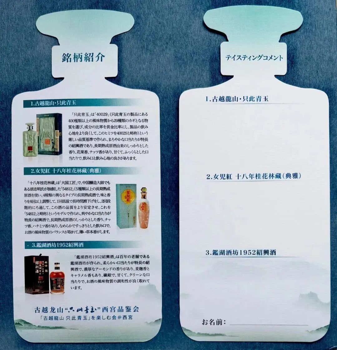为更好地收集日韩消费者对产品的反馈意见,确保古越龙山品牌价值更加深刻地触达到日韩消费群体,本次活动创新设计出有辨识度的品鉴卡。品鉴卡以“只此青玉”瓶体为模板,针对日本韩国品鉴嘉宾,用两国文字在品鉴卡正面分别介绍品鉴的三款产品基本情况,背面可以直接书写品鉴感受。品鉴卡将产品推介和评价反馈完美结合,为“越酒行天下”只此青玉品鉴活动增色添彩。