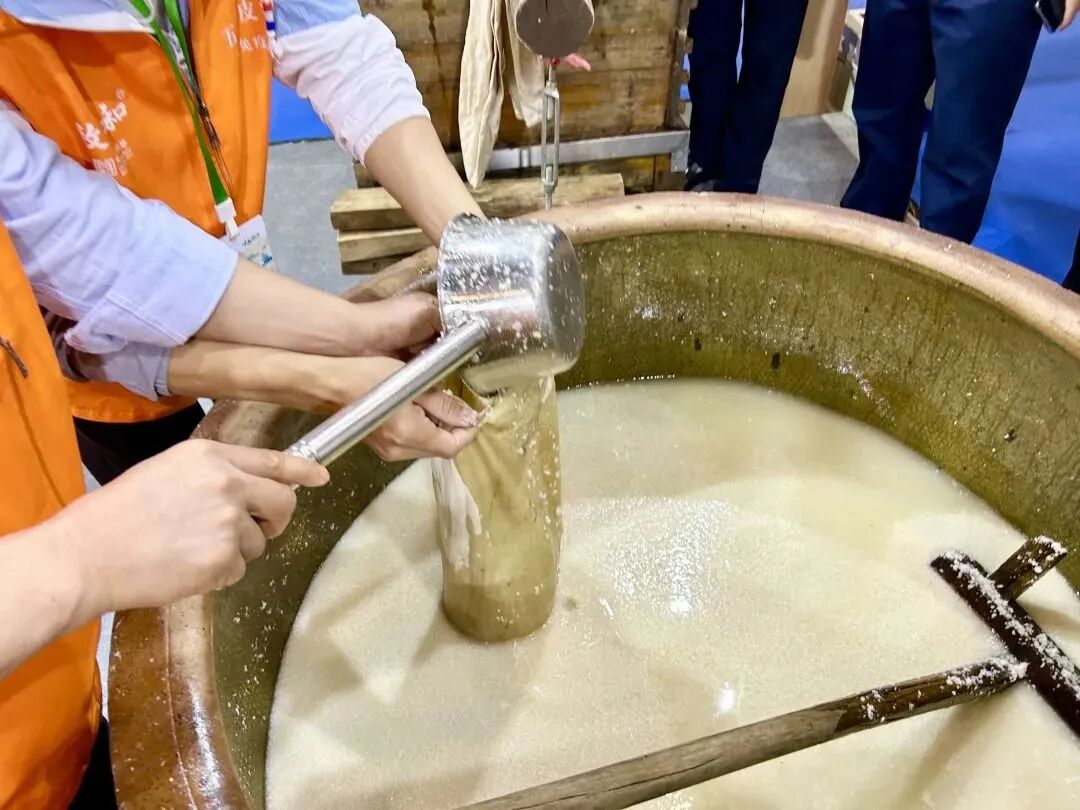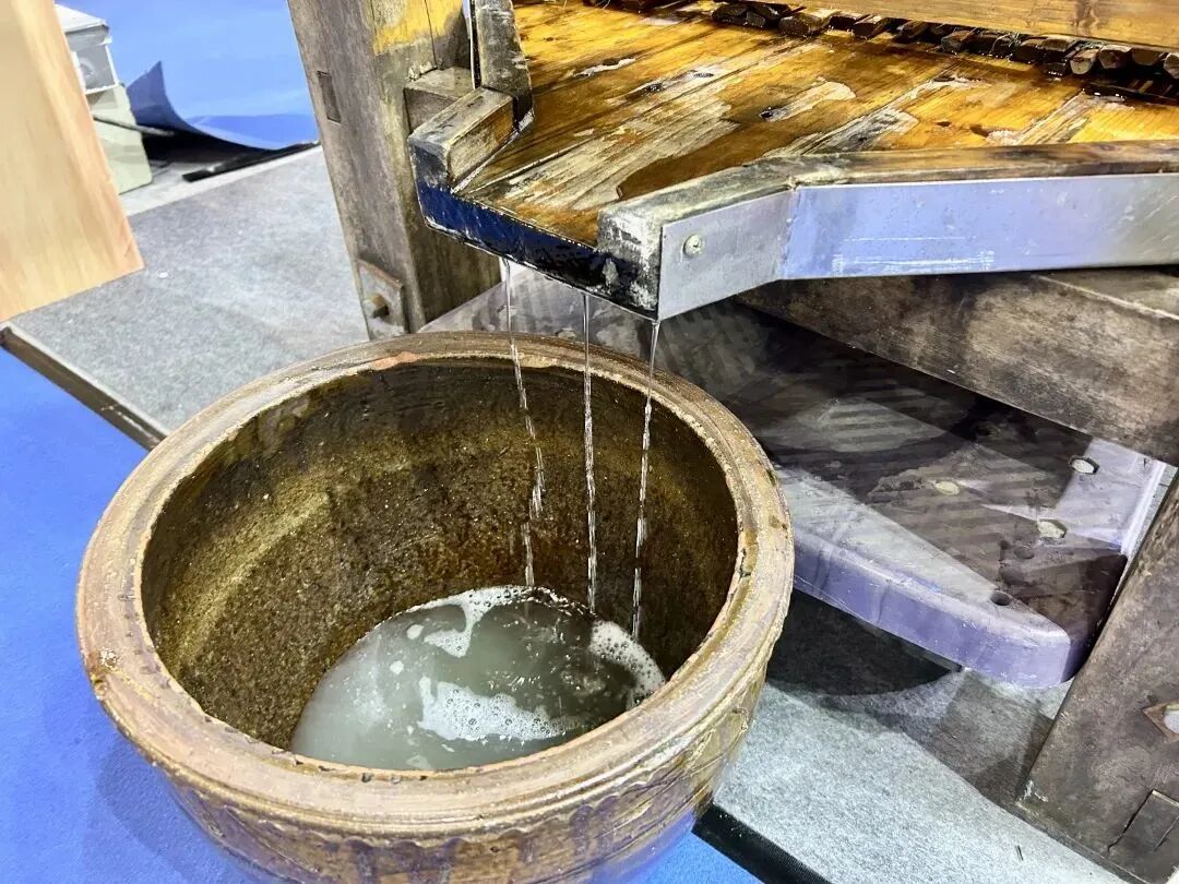 在本次活动中,致中和还把【古法压榨机】搬到了现场!蜜酒的酿制与压榨是致中和五加皮国遗酿酒技艺中的重要环节。观众在现场就能近距离看到酿酒师傅们是如何运用传统方法压榨出蜜酒的!甘醇香甜,参观者品尝过后都是赞不绝口!