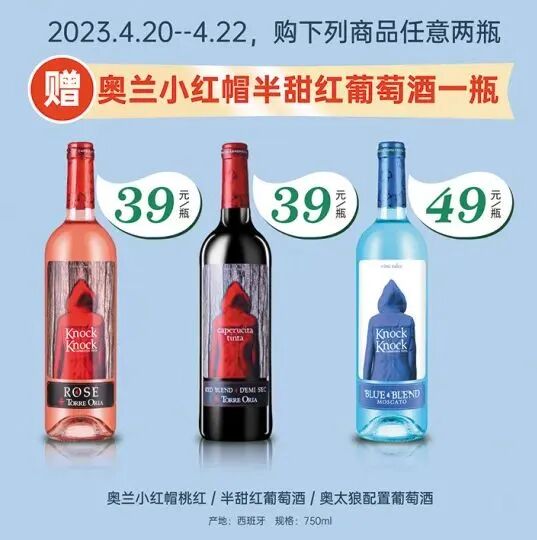 购买任意两瓶奥兰小红帽系列(桃红、半甜、配置酒)送奥兰半甜一瓶!