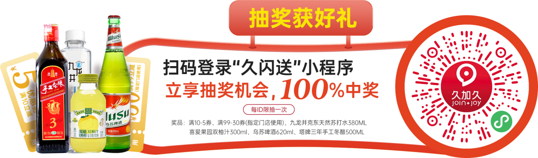 4.20-4.22日,活动会场扫码登录"久闪送”小程序立享抽奖机会,100%中奖!(新老会员均可享受)