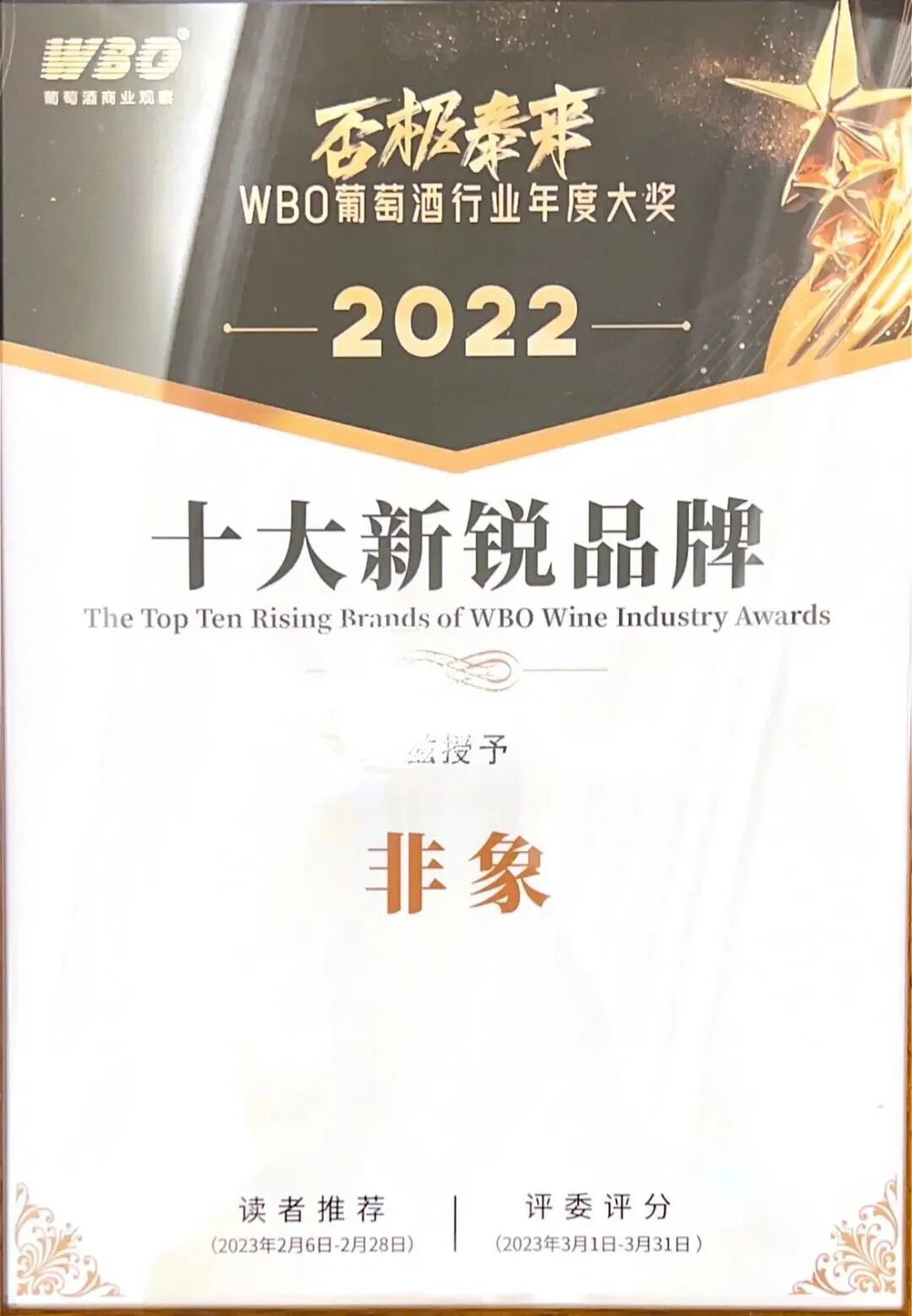 WBO中国葡萄酒市场年度大奖8年以来汇聚了业内外极高的口碑,这来源于WBO举办大奖的初衷——公平、公正、公开地选出葡萄酒行业真正有贡献、坚守、创新的获奖者。非象品牌凭借其大胆与创新的品牌运作,荣获“十大新锐品牌大奖”,是大赛对非象品牌的肯定,也是非象的魅力所致。