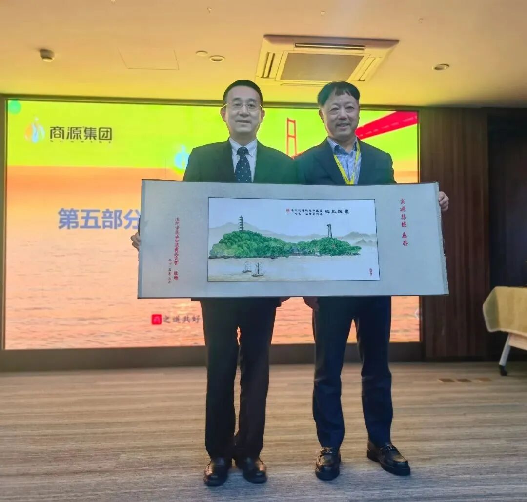 温州市进出口消费品商会会长张浩(左)向商源集团董事长兼总裁朱跃明(右)赠送礼物