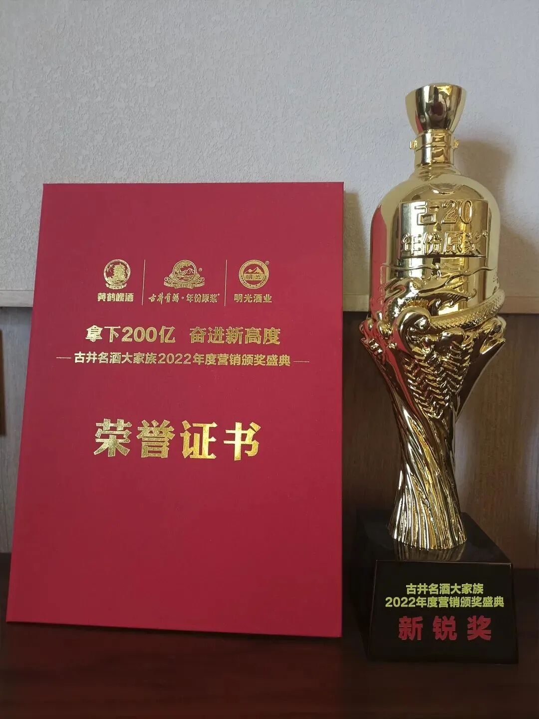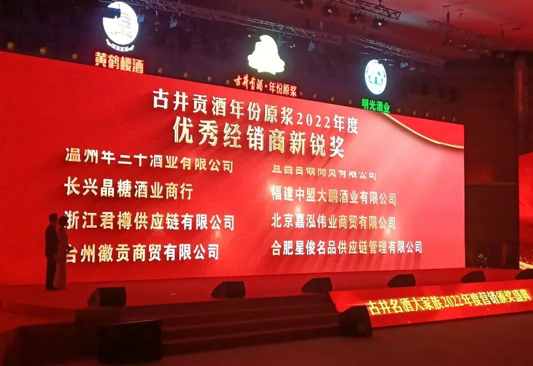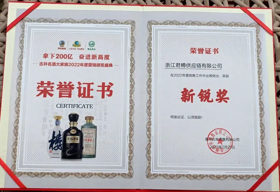 浙江君樽供应链有限公司凭借出色的业绩以及产品品牌运营能力,在众多运营商中脱颖而出,荣获古井贡酒2022年度“新锐奖”荣誉称号!