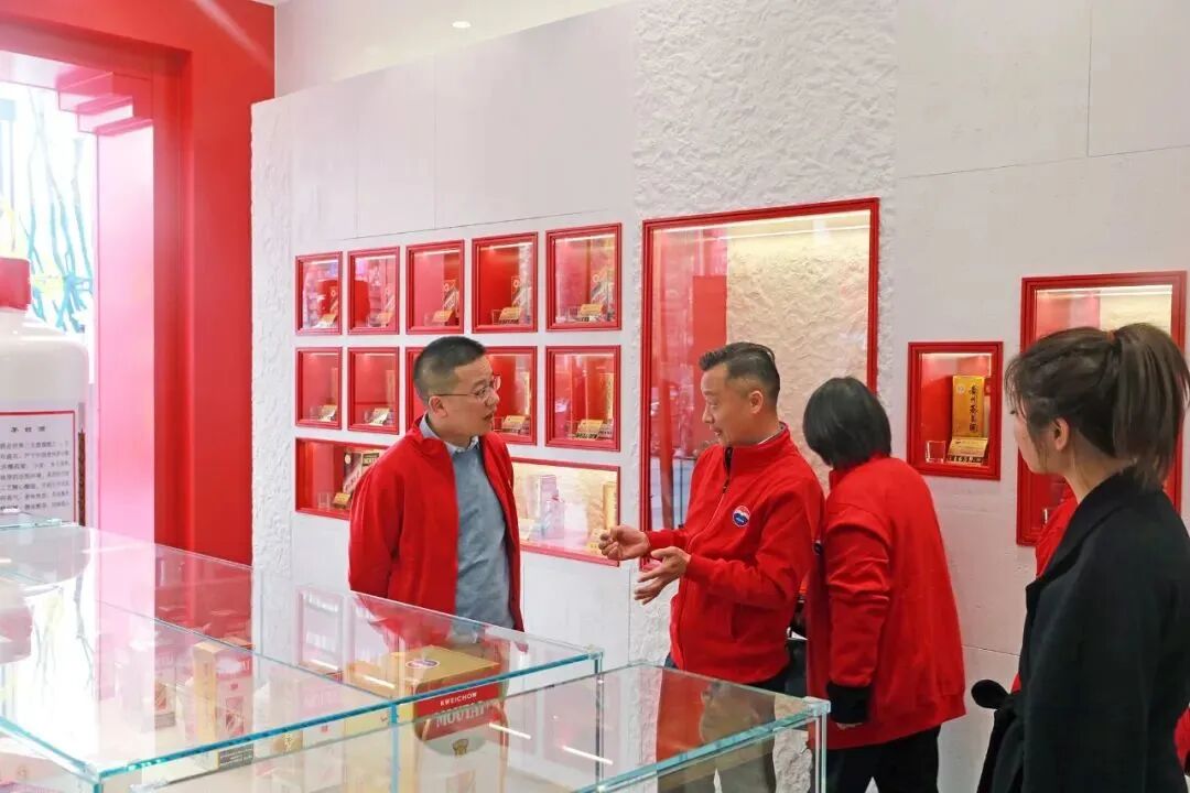 在浙商糖酒第三代贵州茅台专卖店中,一行人跟随专卖店店长参观了门店的每一处功能区域,通过讲解直观了解到店内的陈列展示、休闲品鉴、文化宣传、装修用料等各方面细节。参观过程中,双方就三代店建设、客户服务提升、联谊会工作等内容进行了深入经验交流。