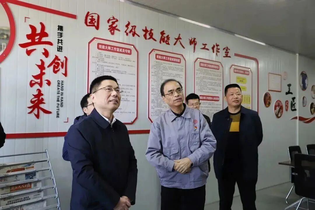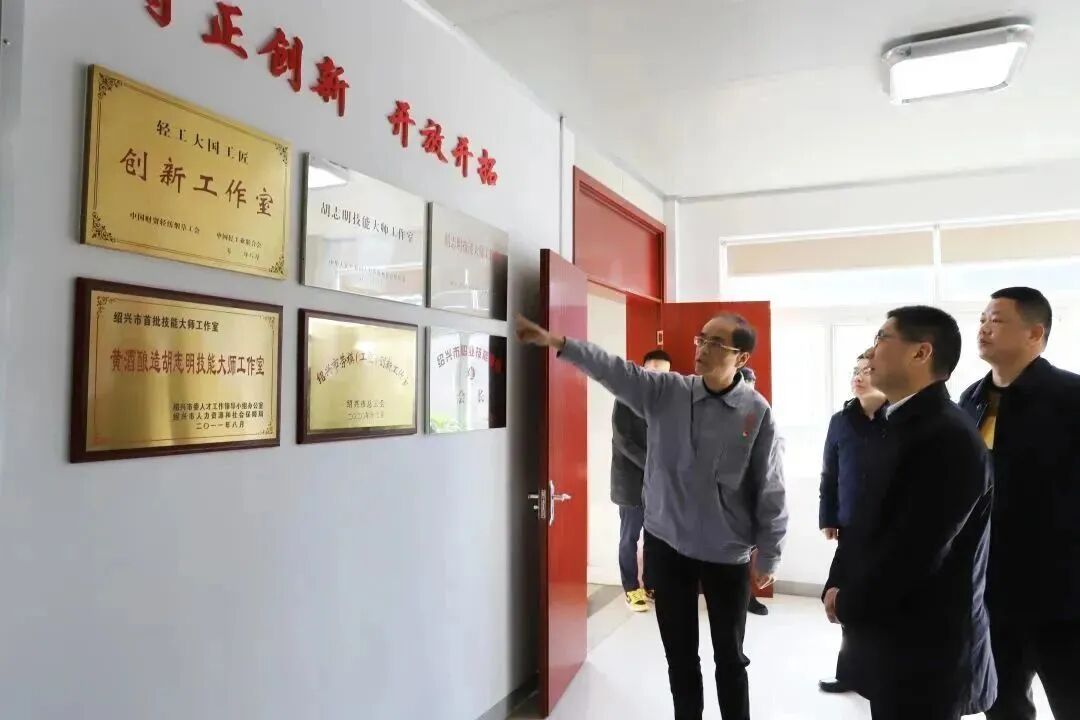 金山中一行在大国工匠、中国酿酒大师、女儿红党委书记、董事长胡志明的陪同下走进国家级胡志明技能大师SKILL MASTER(劳模)工作室,参观了工作室的感官品评室、荣誉墙、产品展区,了解女儿红技能人才培养及人才梯队建设方面开展的工作和技术革新方面开展的相关项目。