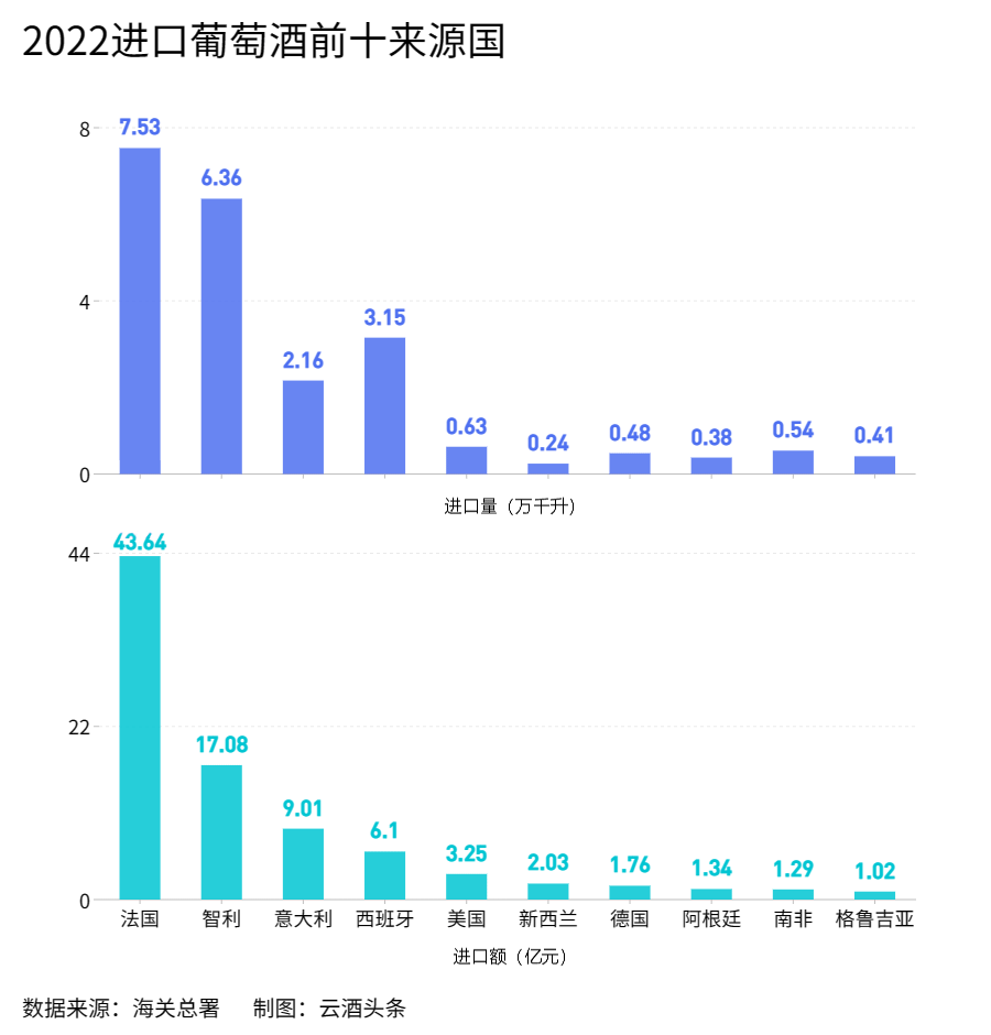 海关总署数据显示,2022年我国进口葡萄酒总量为33.675万千升,同比下降21.1%;进口总额为96.02亿元,同比下降了12.5%。