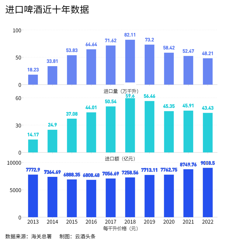 除了进口葡萄酒,2022年我国进口啤酒总体也呈现下降趋势。海关总署数据显示,2022年,我国进口啤酒量为48.21万千升,同比下降8.1%;进口额为43.43亿元,同比下降5.3%。值得一提的是,进口啤酒每升价格同比上涨了约3.0%,连续第七年上涨。