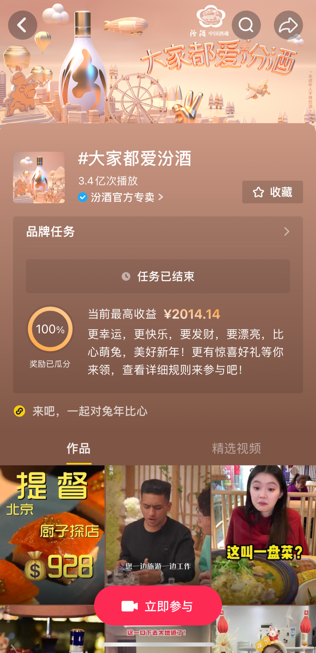 1月25日,汾酒联合抖音短视频平台发起的“大家都爱汾酒”挑战赛上线,活动一经上线,便受到了广大抖音用户的喜爱,3天突破2.5亿关注,让汾酒迎来了2023年的第一个高光时刻。