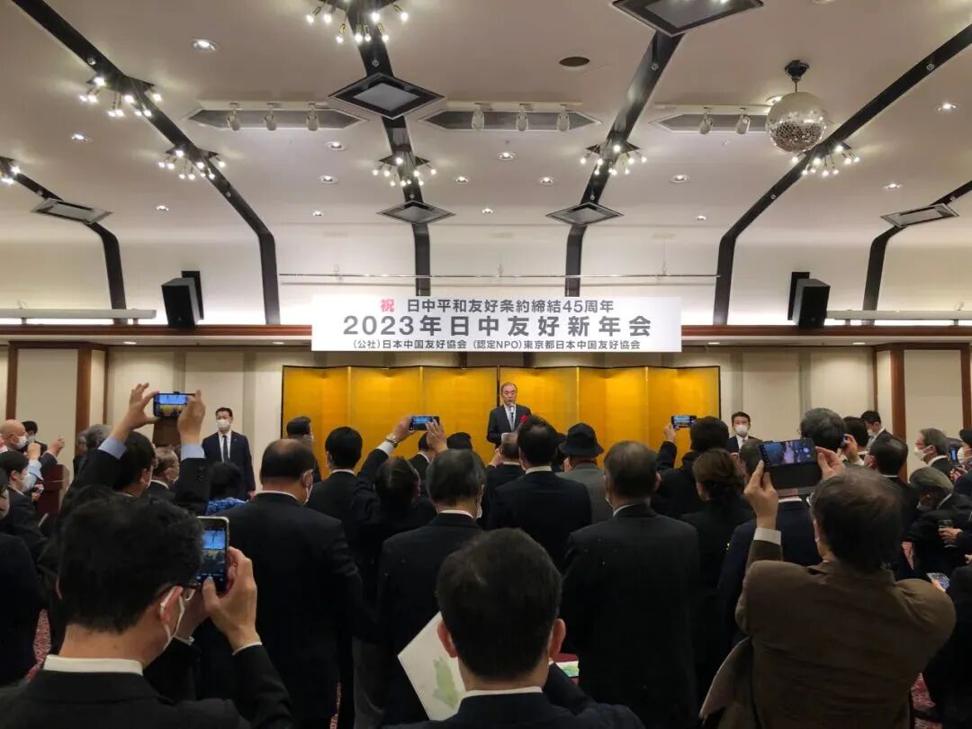 1月30日下午,由公益社团法人日本中国友好协会主办的2023年日中友好新年会在东京如水会馆隆重举行,包括众多日本国会议员在内的中日各界友好人士约200人时隔3年欢聚一堂。