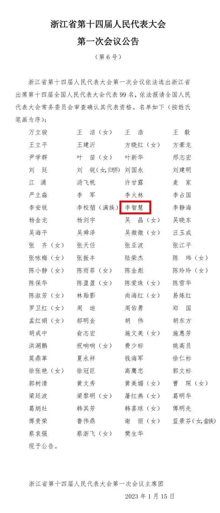 1月15日下午,浙江省第十四届人民代表大会第一次会议举行第三次全体会议,依法选举浙江省出席第十四届全国人民代表大会代表99名。绍兴市有5人当选,他们分别是绍兴市委副书记、市长施惠芳,振德医疗绍兴工厂口罩制造车间主任孟红娟,中国绍兴黄酒集团有限公司质量技术部副部长李智慧,柯桥区漓渚镇棠棣村党总支书记刘建明,三花控股集团有限公司董事局副主席张亚波。