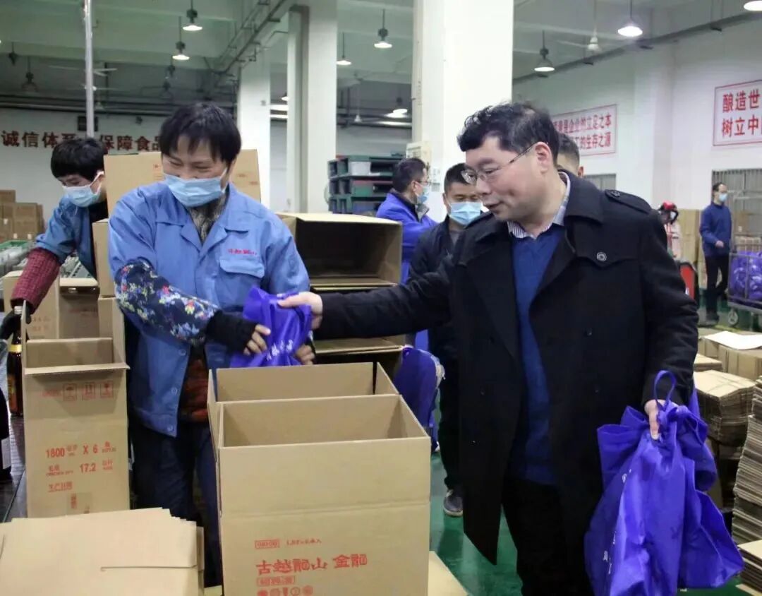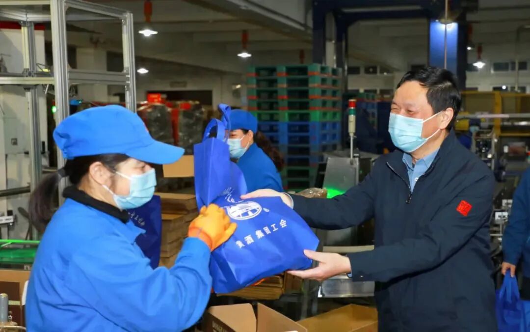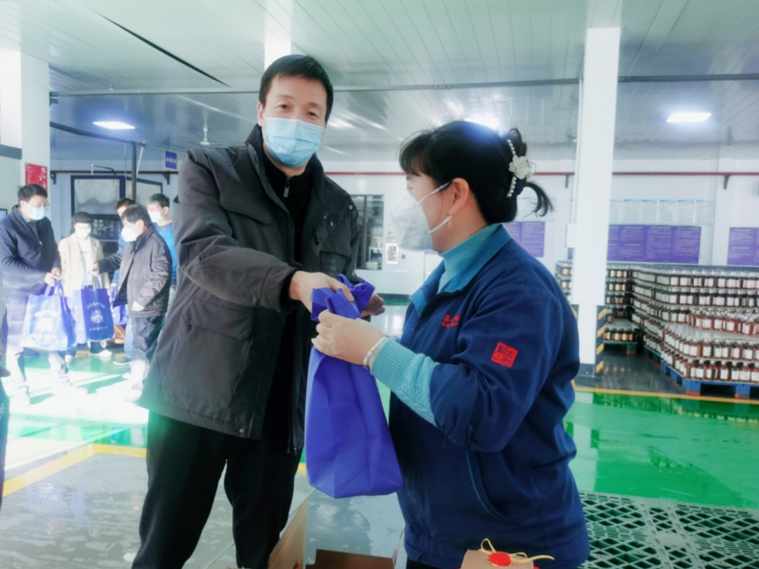 在鉴湖酿酒公司,徐东良总经理慰问一线员工,为他们送上节日祝福和慰问品。