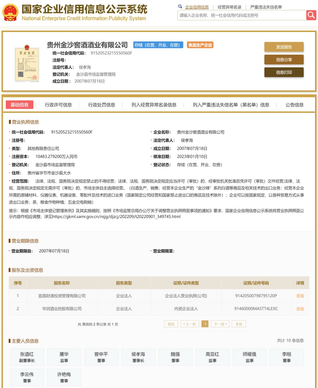 最新工商信息显示,侯孝海出任金沙酒业董事长、张道红出任副董事长。