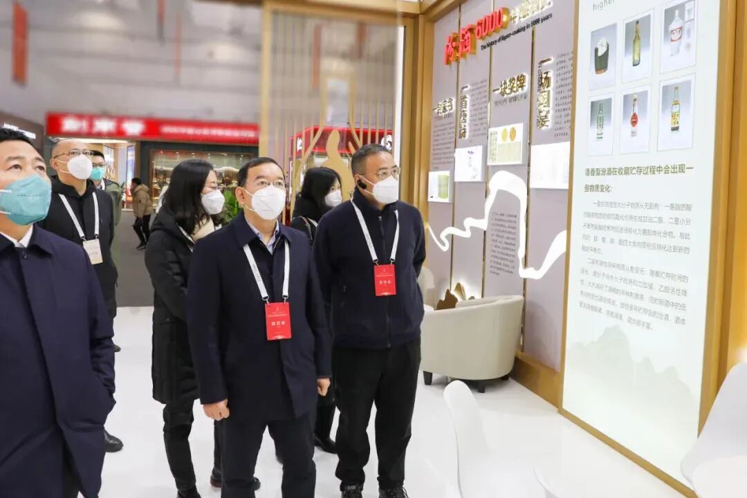 在巡馆过程中,李振寰、韩向宇一行来到汾酒展台前,详细了解了布展情况和陈列的商品信息,聆听了汾酒企业文化、工艺品质、产品展示等内容的讲解。