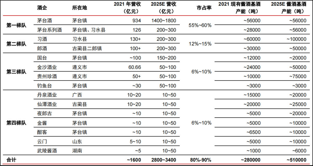 过去十年为酱酒品类扩张期,特别是2012-2016年行业进入大调整期间,酱酒市场快速扩容,各路资本争相进入给行业释放了更多的品类和价值红利。2021年,中国酱酒产能约60万千升,和2020年基本持平,约占我国白酒产能的715.63万千升的8.4%;实现销售收入1900亿元,同比增长22.6%,约占我国白酒行业销售收入6033.48亿元的31.5%;实现利润约780亿元,同比增长23.8%,约占我国白酒行业利润1701.94亿元的45.8%。”资料显示,贵州茅台(600519.SH)2021年度实现销售收入1090亿元,同比增长11.2%;归母净利润约为520亿元,同比增长约11.3%。其中茅台酒营业收入932亿元左右,系列酒营业收入126亿元左右。而贵州习酒、四川郎酒(酱香型白酒部分)、贵州国台去年营收预计亦已突破百亿大关。通过资本快速布局,酱酒获得较快的增速,随着近年投机资金的沉淀与冷静,坚持长期主义的酱酒厂商,逐步引导酱酒品类进入转型升级期。