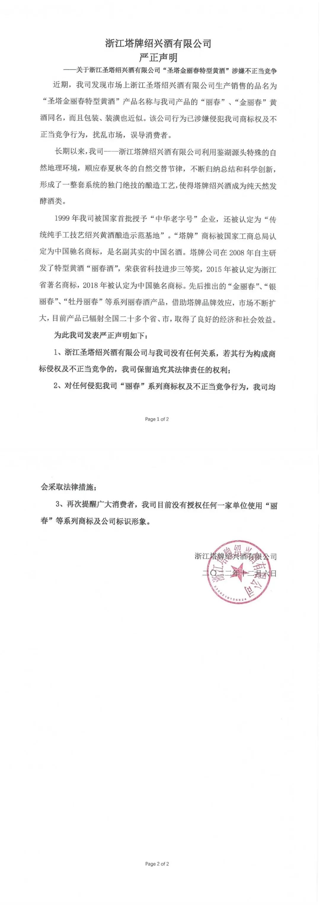 【塔牌】浙江塔牌绍兴酒有限公司发布严正声明!